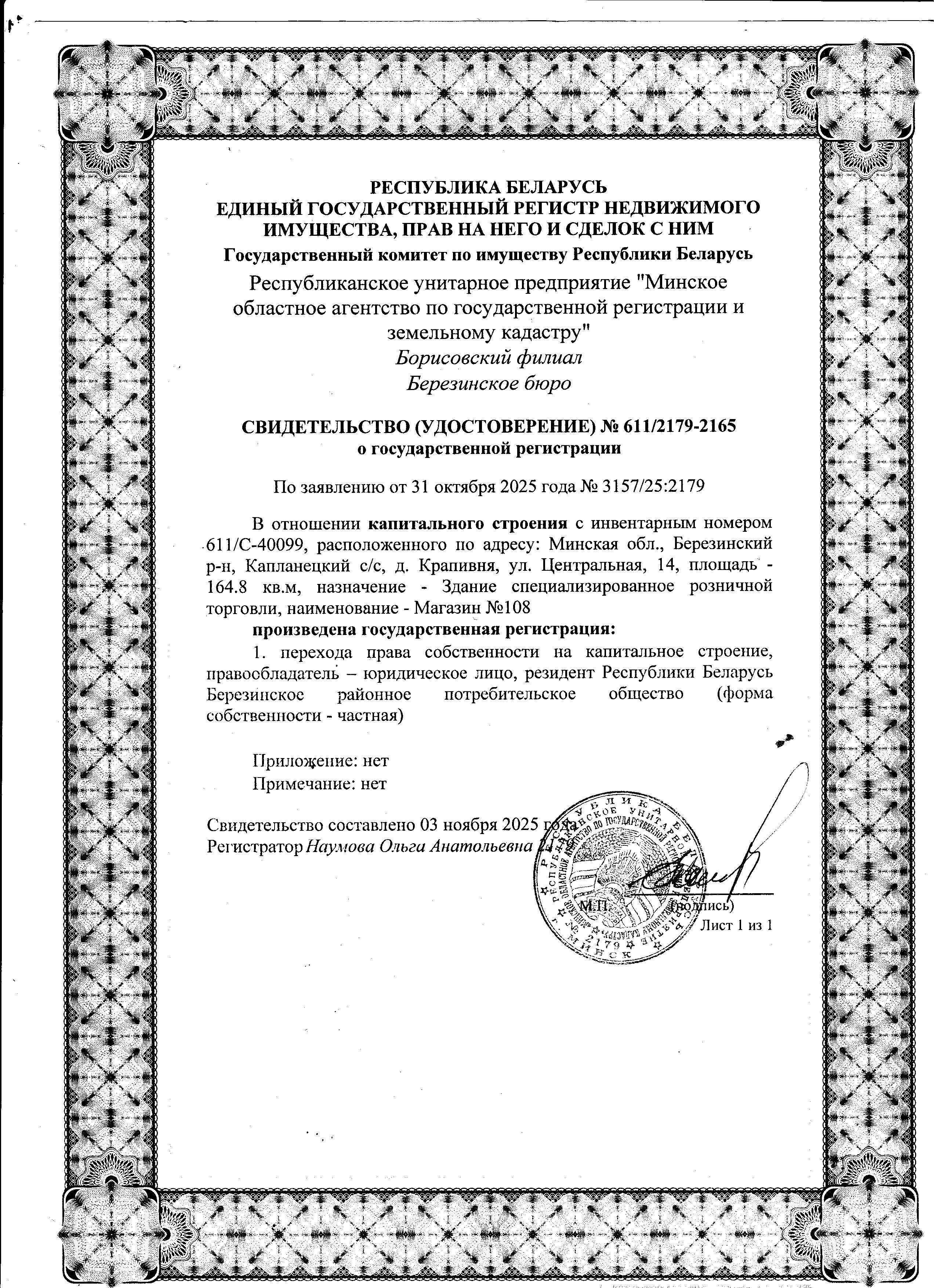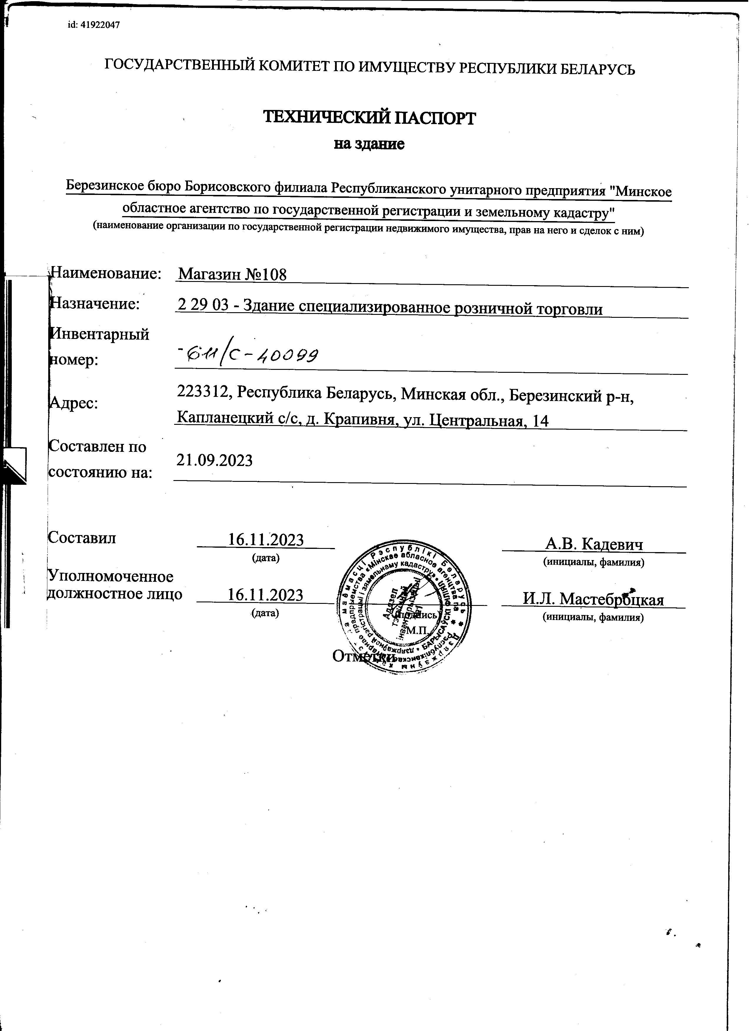 Капитальное строение с инв. №611/C-40099, магазин №108 пл. 164,8 кв.м. (Минская обл., Березинский р-н, Капланецкий с/с, д.Крапивня, ул. Центральная, 14)